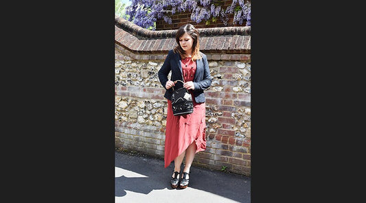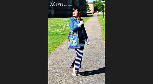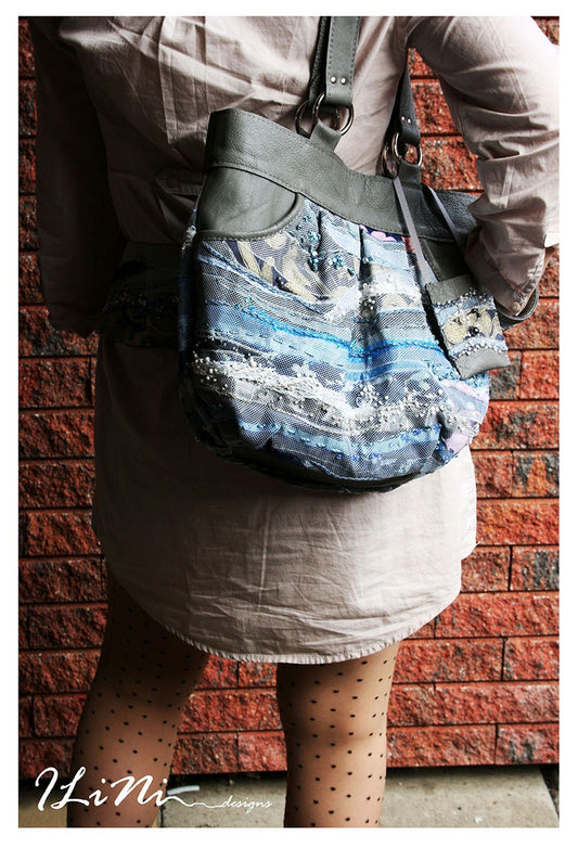 Blue Waves - OOAK handmade handbag with leather detail and hand made fabric, with matching bracelet and belt in tones of blue