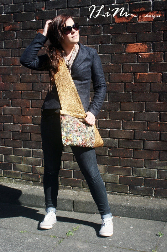 Sunny roses on a gold bag - OOAK handmade leather handbag with altered fabric in gold, yellow and brown tones